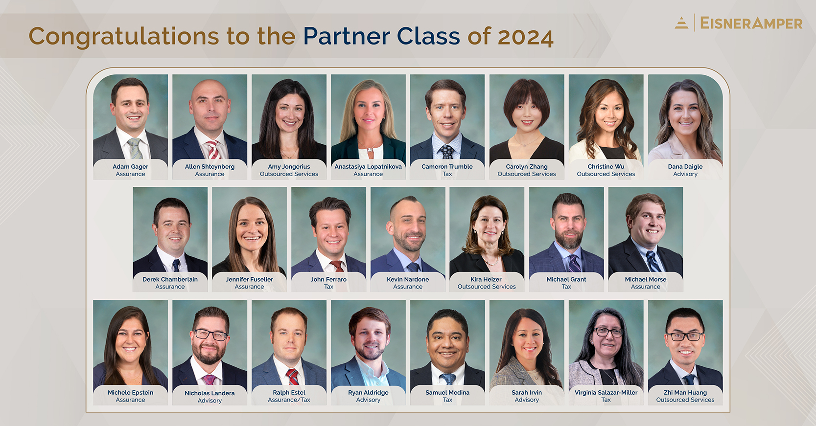 “These outstanding professionals possess deep expertise, a client-centric mindset, and a dedication to continuous learning that is so critical for success in today’s hyper-competitive marketplace,” said Eisner Advisory Group CEO Charly Weinstein. “We warmly welcome these deserving new partners and look forward to them adding even more value for our ever-growing roster of clients.”