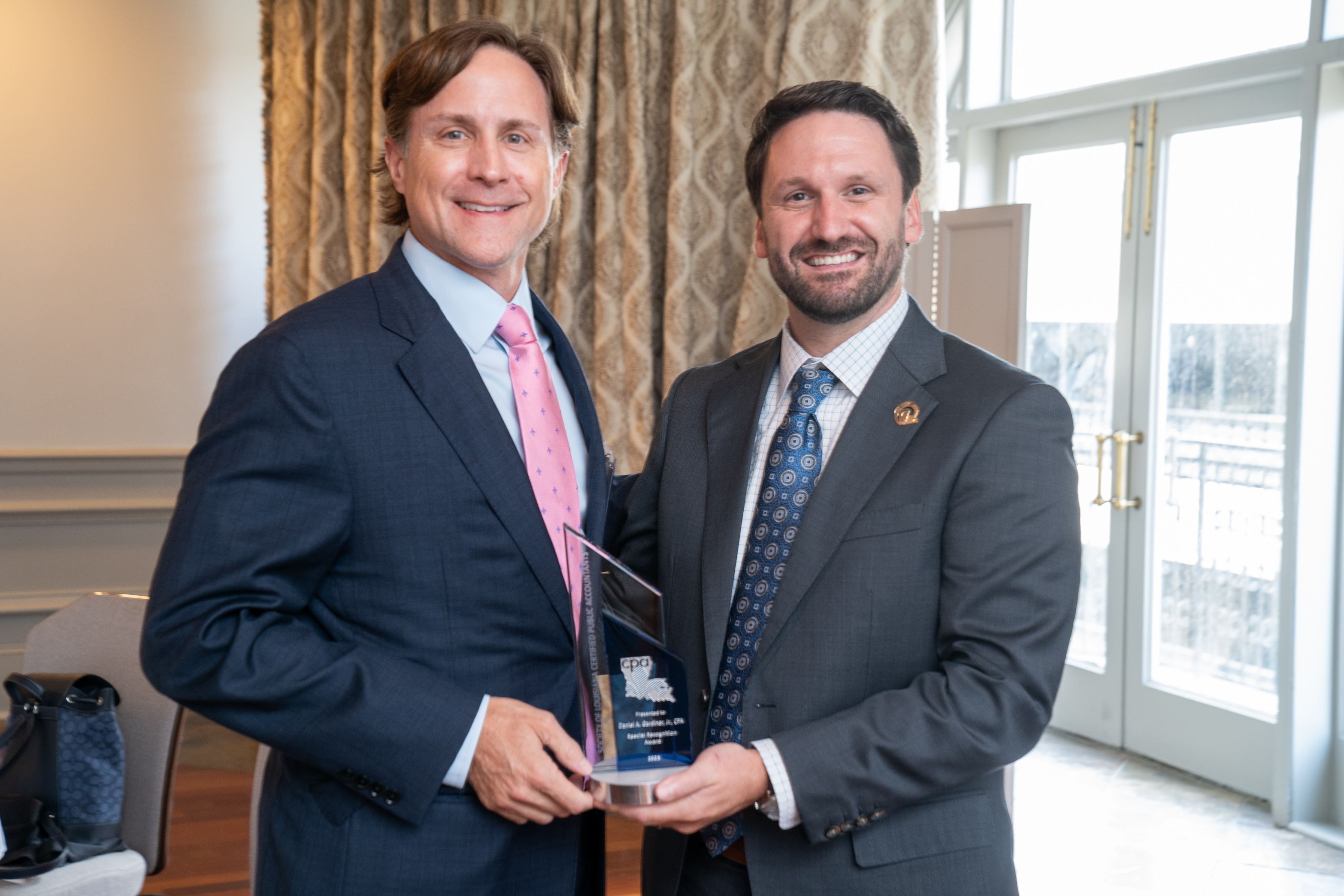 Photo Caption: Dan Gardiner, EisnerAmper Partner-in-Charge for Gulf Coast Markets (left), receives the Special Recognition Award from Louisiana Certified Public Accountants Chair Seth Norris.