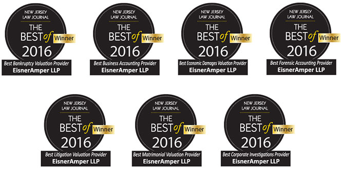 The New Jersey Law Journal readers have spoken. From more than 120 categories, and with several hundred eligible companies competing, EisnerAmper swept the Forensic Accounting, Litigation & Valuation categories in “The Best of 2016 New Jersey Law Journal Awards.”