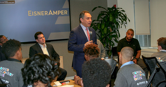 Photo Caption: Nick Tsafos, Partner-in-Charge of the New York City office, gives high schoolers participating in the inaugural NYC Career Discovery Week an overview of EisnerAmper.