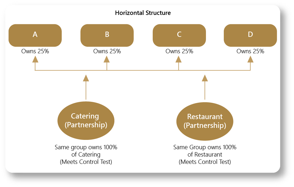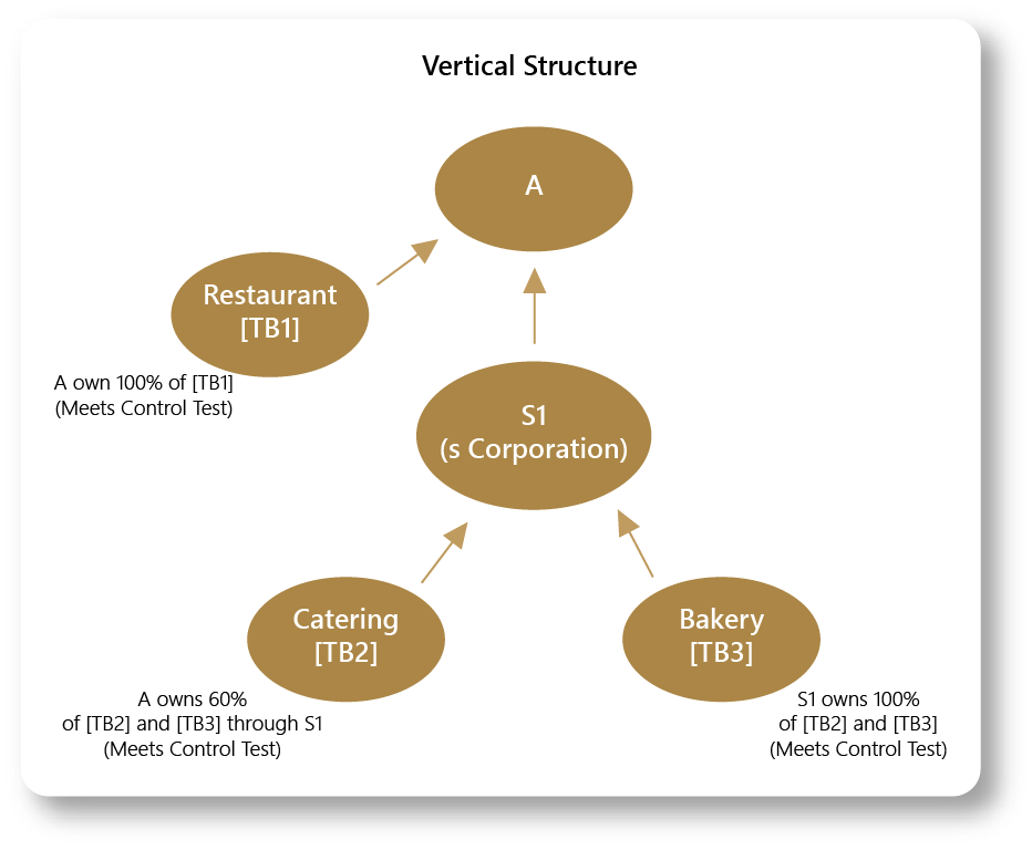 (1) Control Test: This test is defined as the same person or group of persons, directly or indirectly by attribution under IRC Secs. 267(b) or 707(b), owns 50% or more of each trade or business to be aggregated. For small business owners with either a horizontal or vertical business structure, this test is relatively easy to satisfy. See two examples below that demonstrate how the control test works.