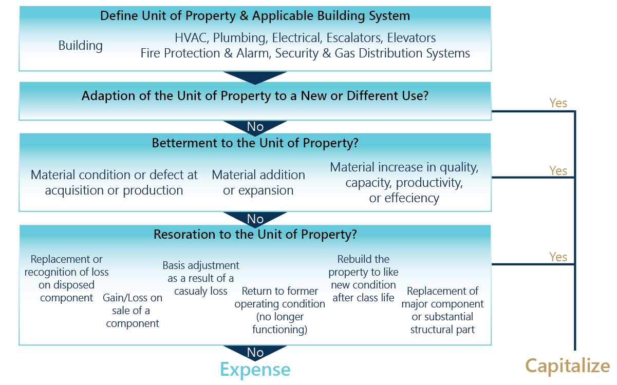 The first step in this process includes identifying the unit of property (UoP) impacting the improvement spending. Once the UoP is identified, the next step consists of running a series of tests, referred to as the “BAR” test, which evaluates whether the improvement spending would be determined as a betterment, adaptation, or restoration.