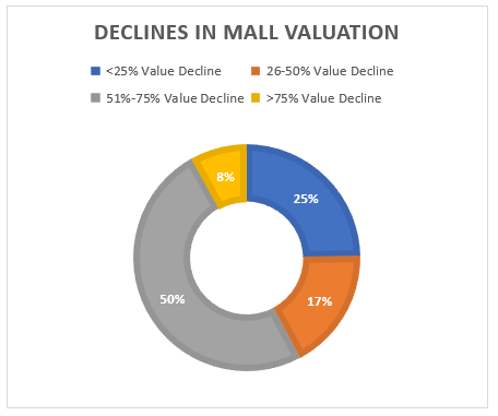Beyond declining net operating income, mall values are falling in the transactional market because there are fewer interested buyers. Many malls have high vacancies and require significant redevelopment, often into more productive uses. While there may be opportunities to create long-term value through re-tenanting, re-use, or developing new properties in a portion of the parking lot, these strategies require substantial capital. A new owner must also negotiate with existing tenants as well as community leaders whose constituents do not want to lose their place to gather and shop. As a result, the cap rate premium is necessarily higher on these properties, putting further downward pressure on values.