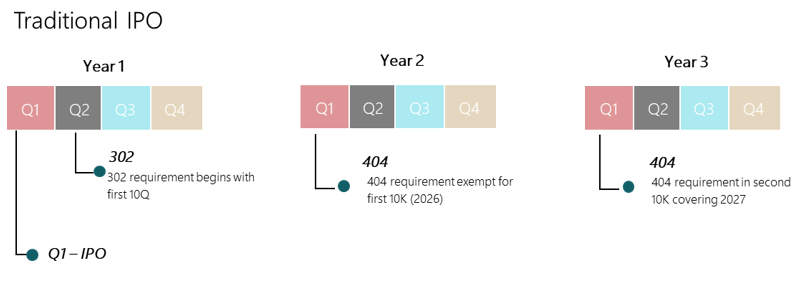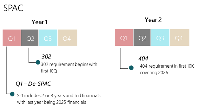 Some de-SPAC transactions may require SOX 404a or 404b compliance in the year the transaction is completed. Below is a comparison sample timeline detailing SOX compliance requirements for a SPAC vs a company going public through a traditional IPO.