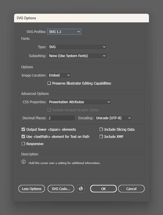 - Save the file as an SVG. Some tools will prompt you for settings. For example, these are the important settings in Illustrator: